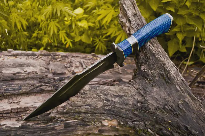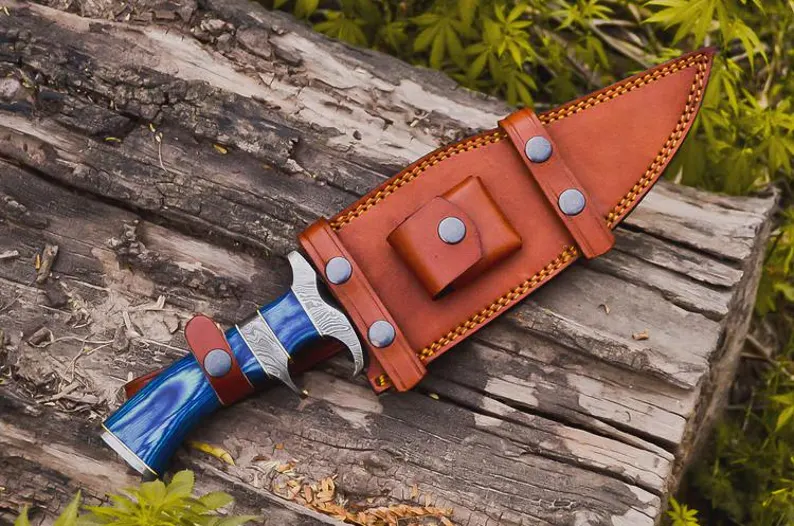 Over all length 15 inches, Blade length 9-10 inch, handle length 5-6 inch, Handle material Blue colour wood, Thickness 3-4mm, Sheath Vegetable tanned Cowhide leather