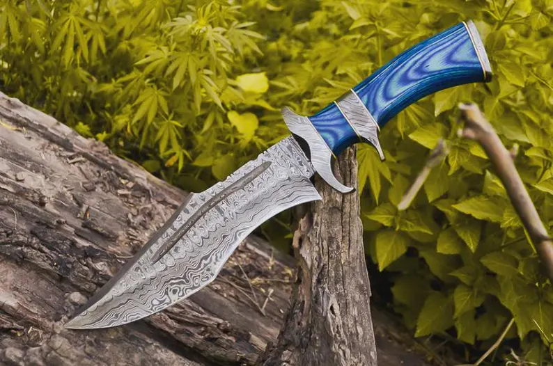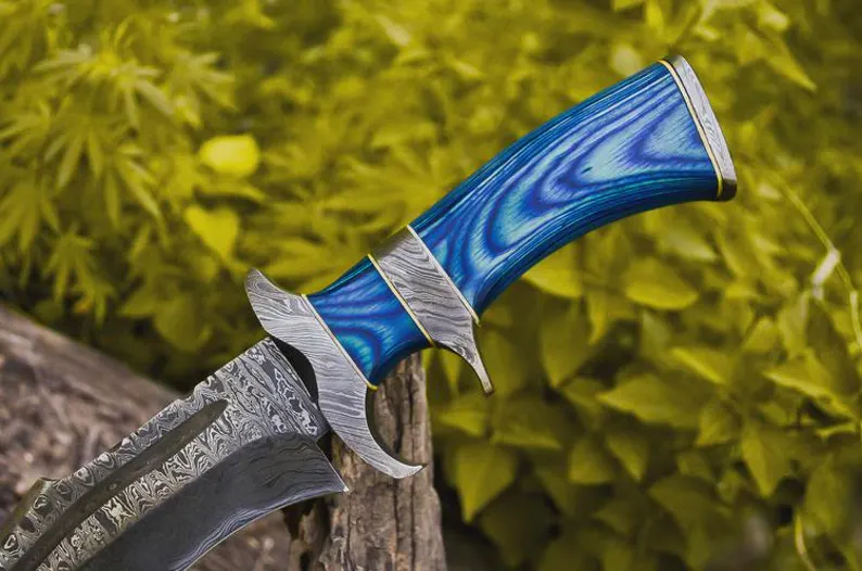 Tactical knife features a blue handle and a fine edge, full tang Damascus steel blade and strong Damascus guard