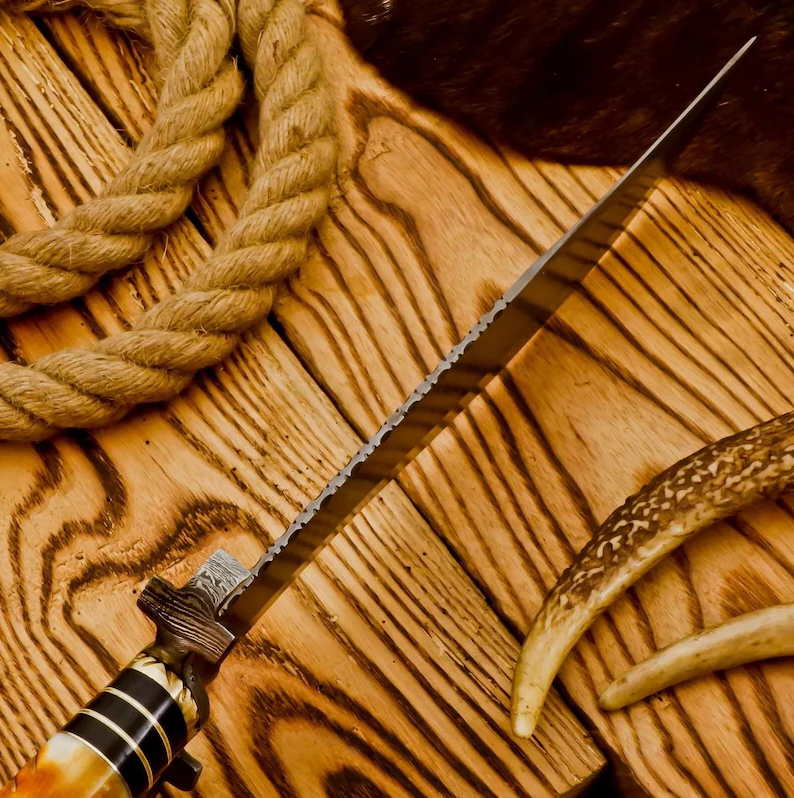 Our blades are meticulously crafted from high-quality Damascus steel, custom-made exclusively for you. The blade showcases a saw-blade effect at the microscopic level, allowing it to remain sharp while other blades may dull. The blade has undergone exceptional heat treatment, ensuring rockwell hardness.
