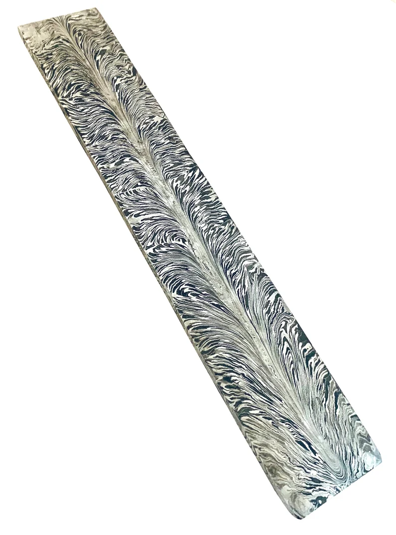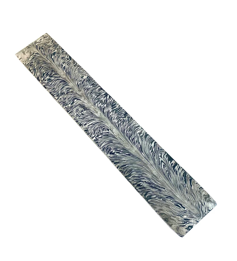 remium Wavy Feather Pattern Steel Billet Bar 30x5cm Bush Crafts Knife making Features: Damascus billets are made with 15N20 & 1095 steel Easily workable Bars / Billets You can Drill Grind as per your requirements You might need to temper and etch as required after your work. The Billets have been etched to show the pattern. Best result when you finish your work ITEM: 1900 Overall Length: 30.40 cm APPROX Width: 4.80 – 5.0 cm APPROX Shipping: We ship worldwide and the buyer is responsible if there is anything wrong with the address. The postage proof is updated soon after the dispatch. Returns: We accept returns as per our policy and the buyer is responsible for the return postage. Should you need any help with your purchase please contact us.