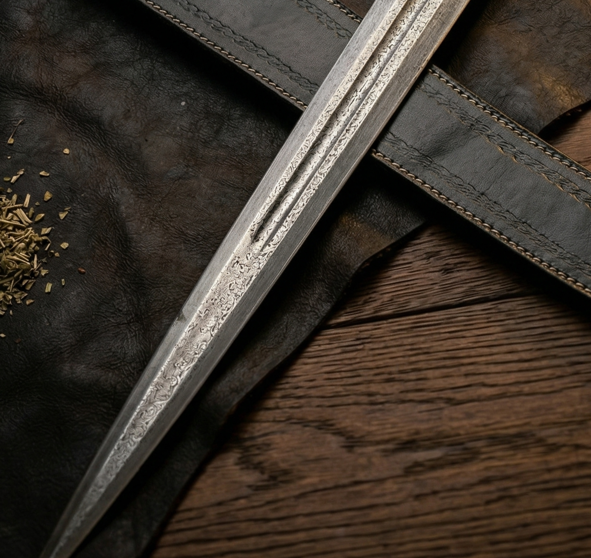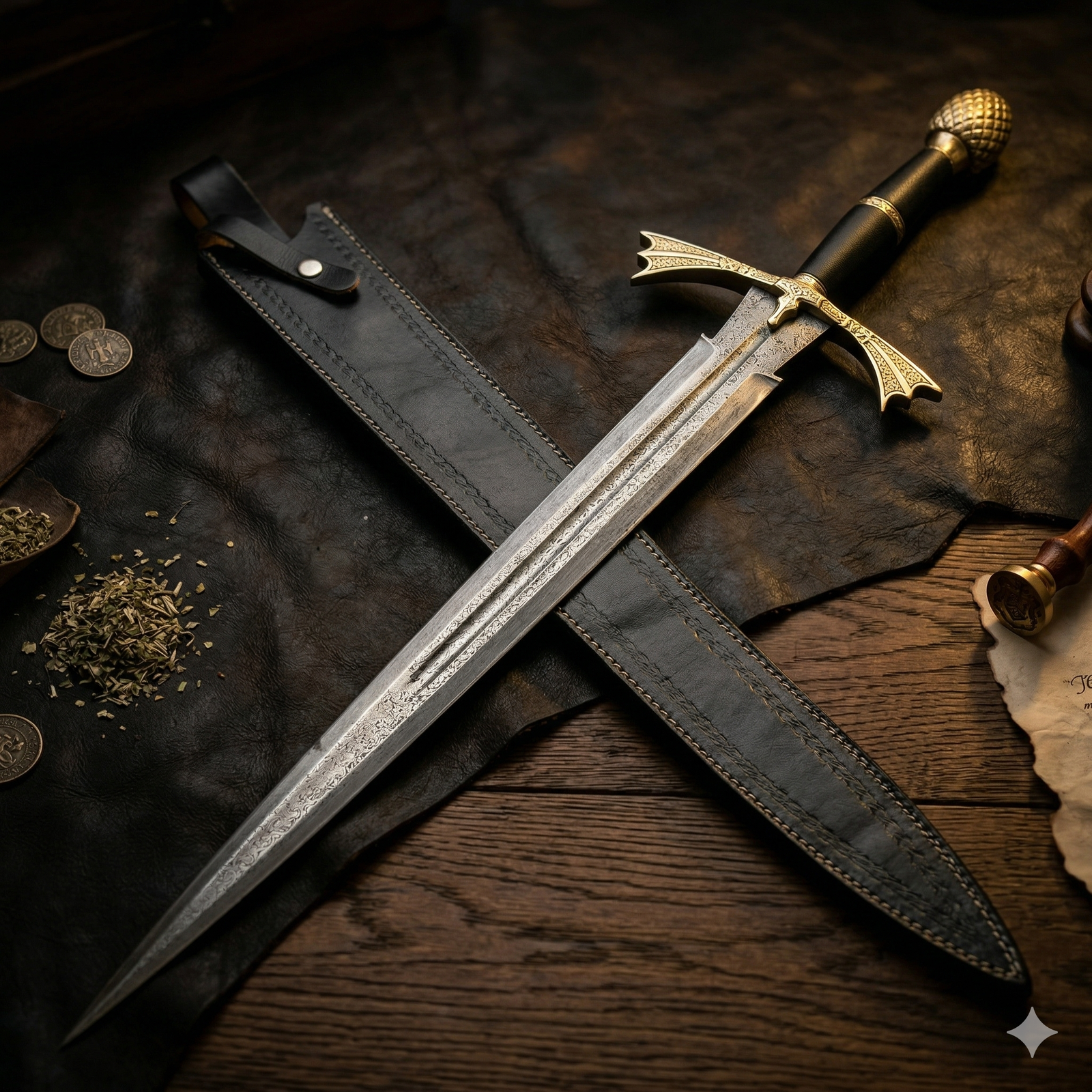 • Intricately Etched Blade: The high-carbon steel blade is adorned with traditional scrollwork and floral etchings, giving it a sophisticated and legendary look.