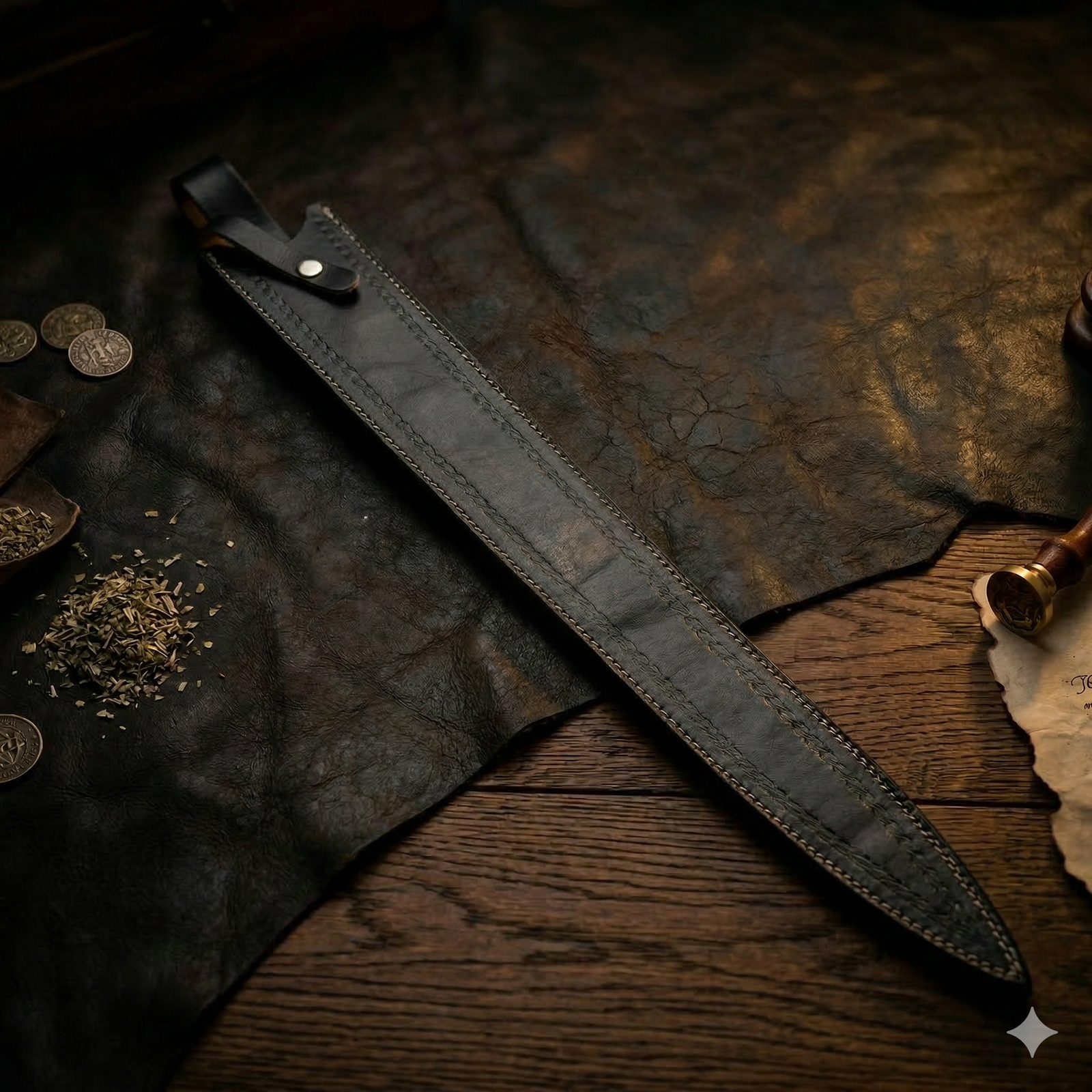 • Custom Hand-Stitched Sheath: Includes a heavy-duty black leather scabbard with a belt loop, designed for both protection and a professional presentation.